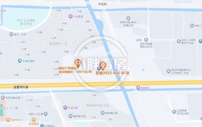 北面是住宅小区莲花新村,东面河流,南面是独墅湖大道,隔河就是住宅小区翰林缘,西面则是在建的保利珺华赋。