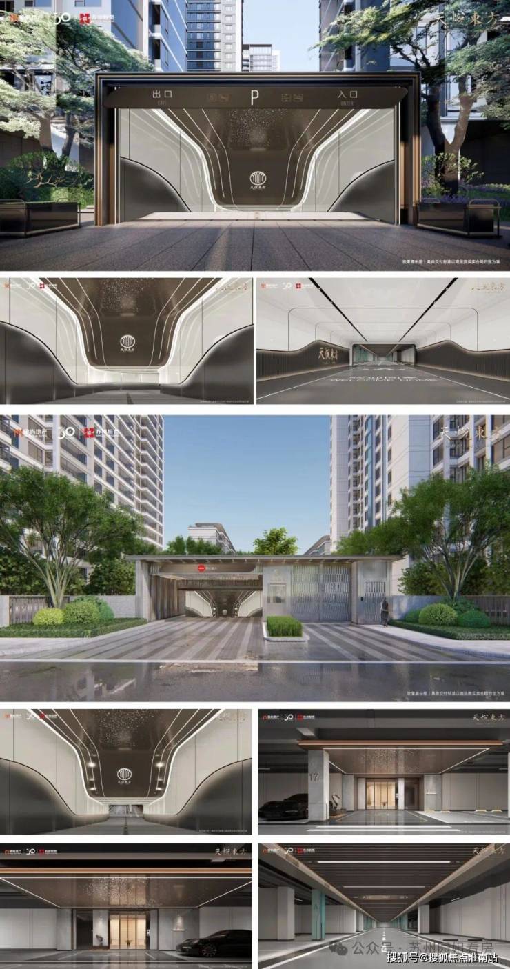 星空顶入库坡道、入库坡道石材铺装、车道入口迎宾玄关、莫兰迪色分区(柱面)、橘皮防滑环氧地坪、星光吊顶入户前厅、人脸识别精装电梯大堂,千万级豪宅礼序,从归家开始。