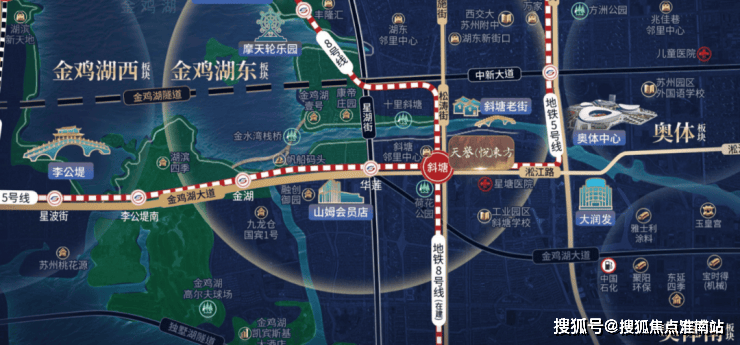 主干道路:横向可通过金鸡湖大道、中新大道(含金鸡湖隧道)直达湖西苏州中心商圈;纵向依托星塘街、星湖街串联园区南北。