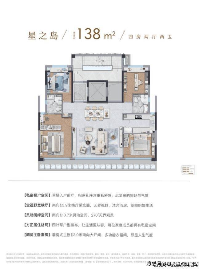 这个四房虽然建面只有138㎡,但因为是5层叠墅的高得房率,以及室内空间的高效利用,其功能和尺度感,给人的感觉十分惊艳。
