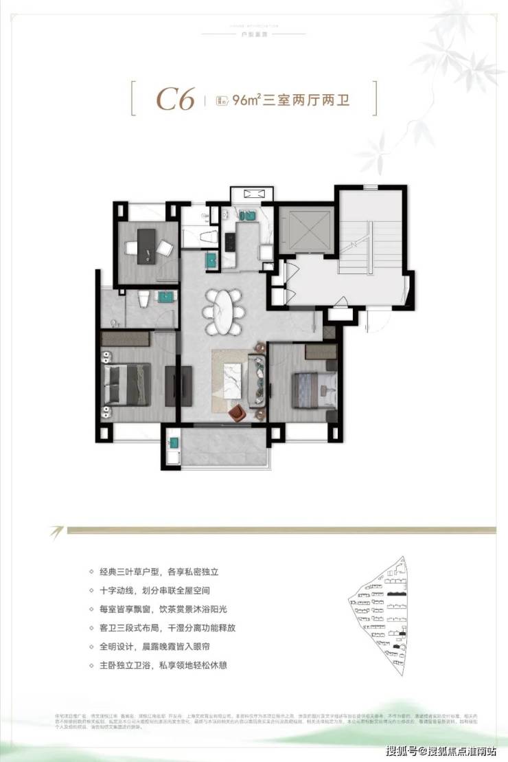 建面约96㎡户型,与C-4户型功能间大致相同,同样是一个功能性和尺度感完美结合的明星户型,建筑面积上少了3㎡,节约购房成本。