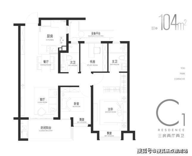 建面约104㎡三房,与公园共生