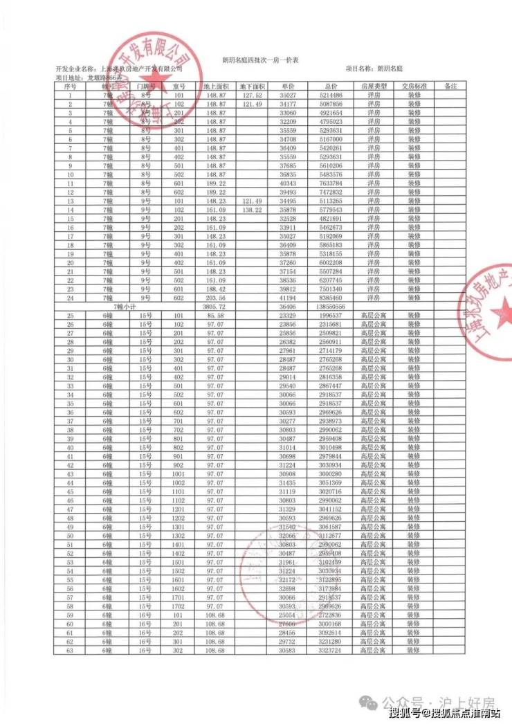 项目一房一价表
