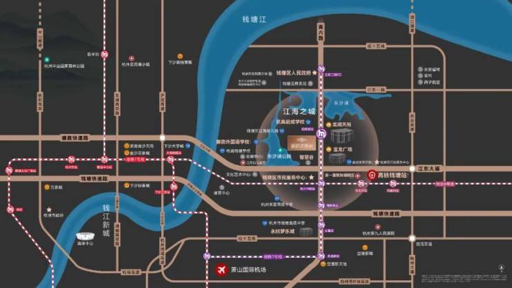 项目落笔钱塘核芯,面朝东沙湖,一线湖景举步即达,感受约540亩湖水流淌的自然治愈力;隔街对望龙湖江东天街,盛载万象生活,咫尺地铁口(7号线启成路站),娱乐休闲之余沉浸自然与都市璀璨的和谐共生。