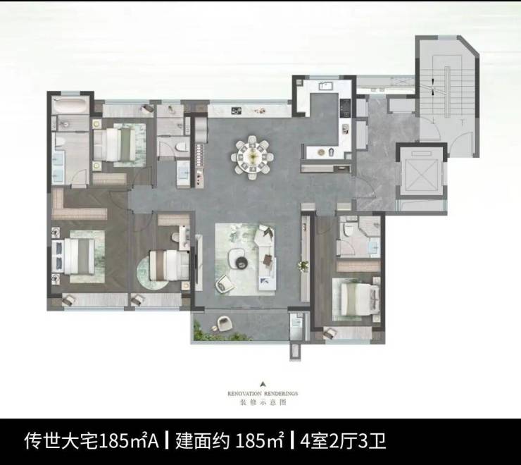 185㎡四房两厅三卫:大平层奢居,主卧带独立衣帽间与卫浴,空间感强
