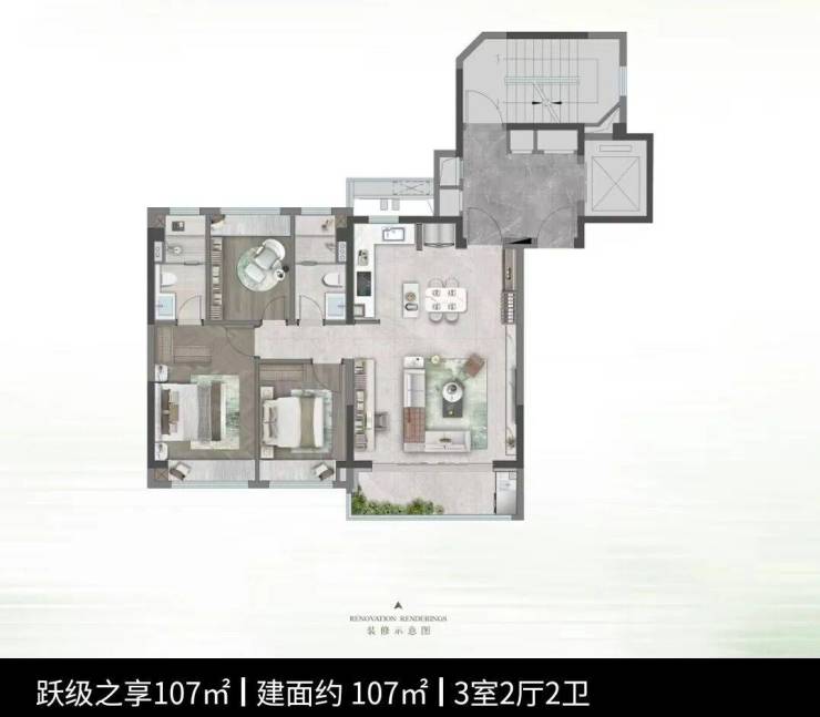 107㎡三房两厅两卫:南北通透,双阳台设计,得房率高