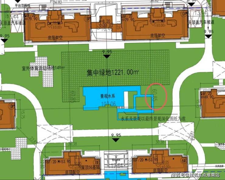 从设计图上看,这个小区地面布置了大量的景观水系。南面主入口的小区门厅外,就做了大面积的对称水景,穿过大门后,又是下沉庭院和景观水系,整体连贯铺陈,仿佛湖中小岛。