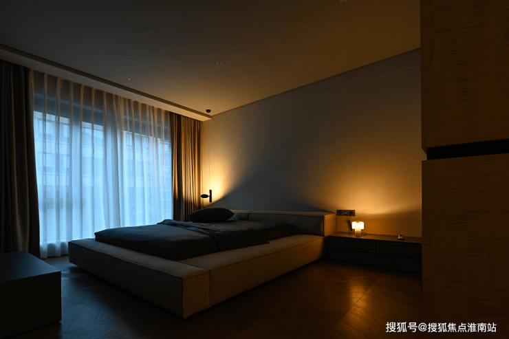 从客厅到卧室,光线随之变暗,宁静的氛围越发的浓烈了。卧室内的灯光柔和且安静,为业主提供了一处完美的休憩场所。