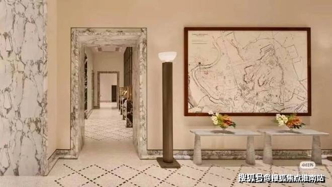 另一个样板房是约320平方米的中间套,采用两梯两户设计,独立门厅。