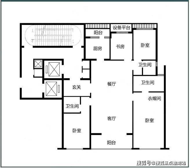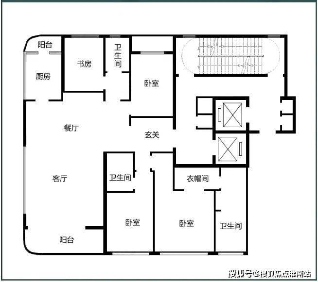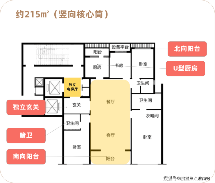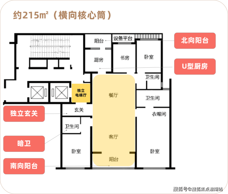 215㎡的纵置核心筒户型,与横置核心筒相比, 整体布局更加紧凑,但功能分区同样出色。