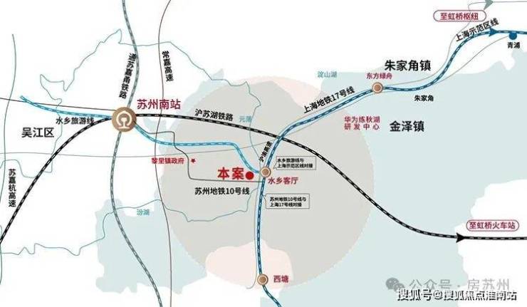 多维路网:浦港路东延未来直达上海,沪苏通勤畅行无阻。沪渝高速直连上海中轴延安路高架;通苏嘉甬高铁、沪苏湖高铁、沪苏嘉城际铁路交汇于苏州南站。水乡客厅站将汇集上海地铁17号线、苏州地铁10号线、嘉兴轨交3号线以及沪苏嘉城际铁路线等线路,加速交通一体化;