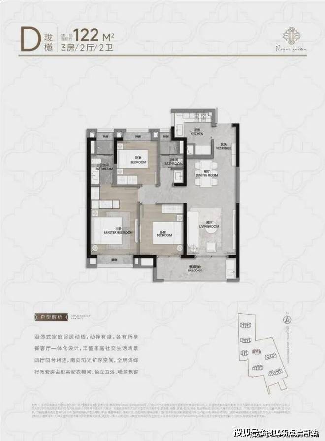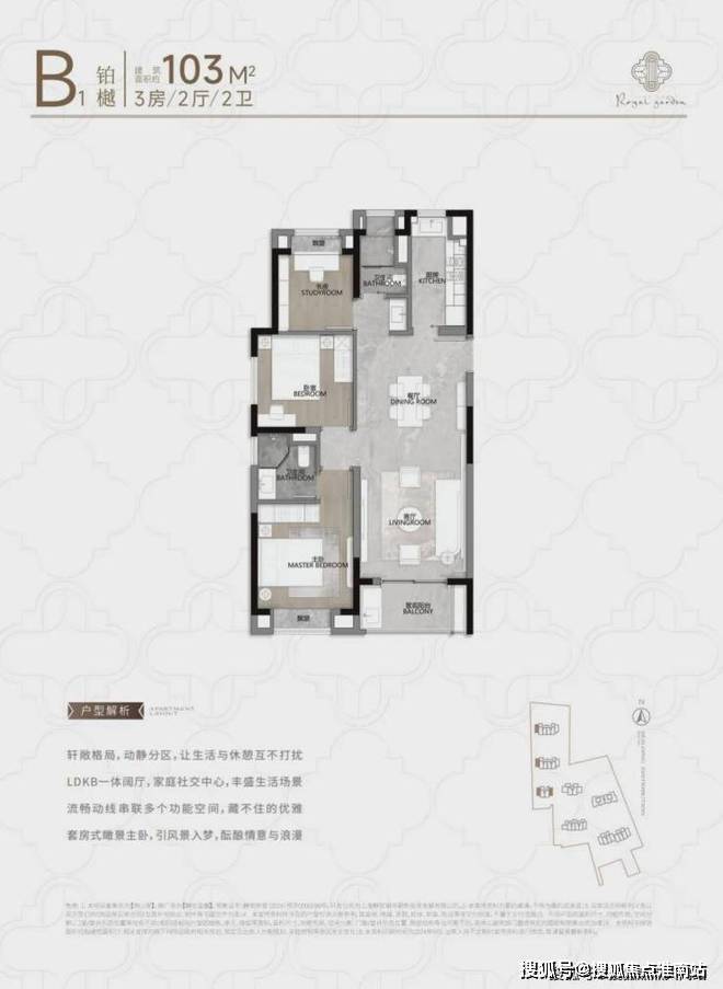104㎡3户型特点:该户型多为楼栋的东边套,是一个观景户型.客厅连接270°阳台,视野出众.双卧朝南,阳光满溢.从次卫布局看,如果家庭人口较少,该户型还能做成双套卧.