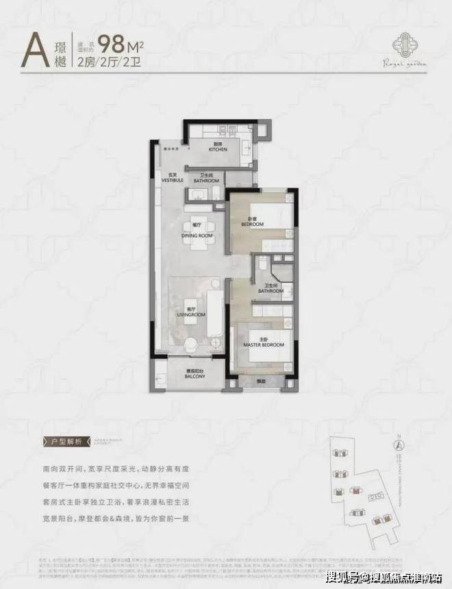 建面约98㎡宽阔两房,非常适合单身或是年轻的小家庭置业.其得房率最高约79%,相较于市面上大多70-75%的项目,实实在在地省下了不少空间的置业成本!
