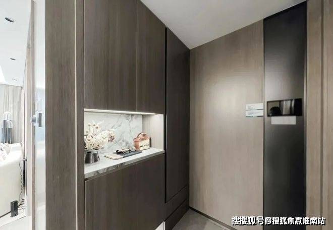 从进入门的那一刻开始,就感受到这套户型的改善之处:独立入户门厅,外加独立储藏空间,给予了业主归家的仪式感,也保证了私密性。