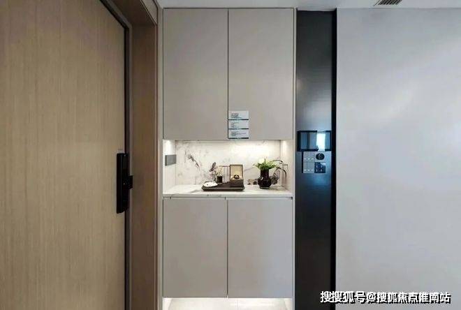 在细节上同样不遗余力。比如入户后的玄关柜是交付标准,打开厨房柜体、镜柜等各类收纳空间时均有惊喜;再如客厅和主卧均采用弧形吊顶,还有风暖浴霸、玄关顶面感应灯等细节,都透露出项目对品质生活的追求。