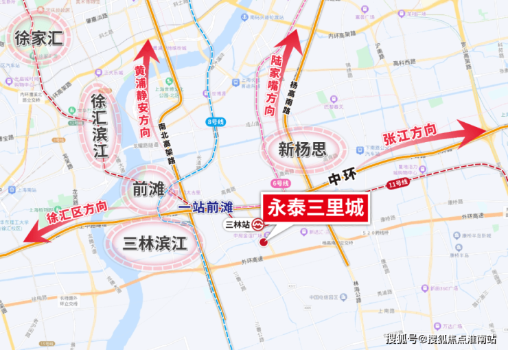 项目与11号线三林站直线距离仅约350米,步行可达,进站后1站即达前滩,2站即达徐汇滨江。
