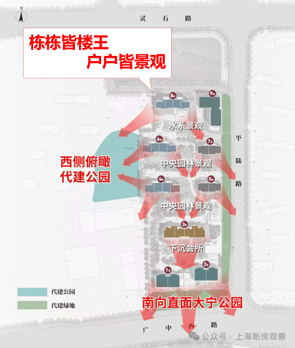 从规划图来看,项目前排可直面大宁灵石公园无敌景观;而办公部分设置在地块东北侧,也有隔断进行出入口区分,对住宅部分来说几乎没有影响。
