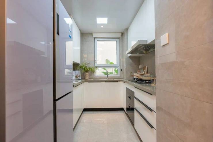 全屋动静分区,其中 动区的客餐厅走廊、厨房浅灰色亮面仿大理石砖、静区卧室地面则采用书香门地实木复合地板 ;