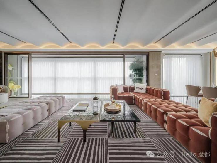 温暖舒适的面料造就了空间温情的一幕,金属是这个空间的常见材质,在现代都市中代表着冷峻的表面,而在家庭厅,绿植、曲线、面料中则描绘了生活小家的场景,在光线的映射下,更显得温情融容,实现了空间与人的情感链接。