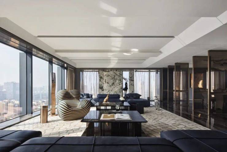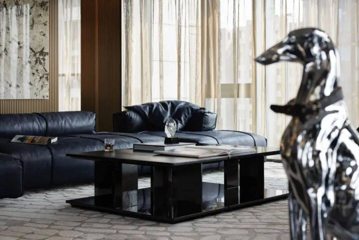 简洁有力的皮革家具充分彰显了空间的张力,金属色豹型装置如空间中灵动的一笔,增加了艺术性释放了松弛感。
