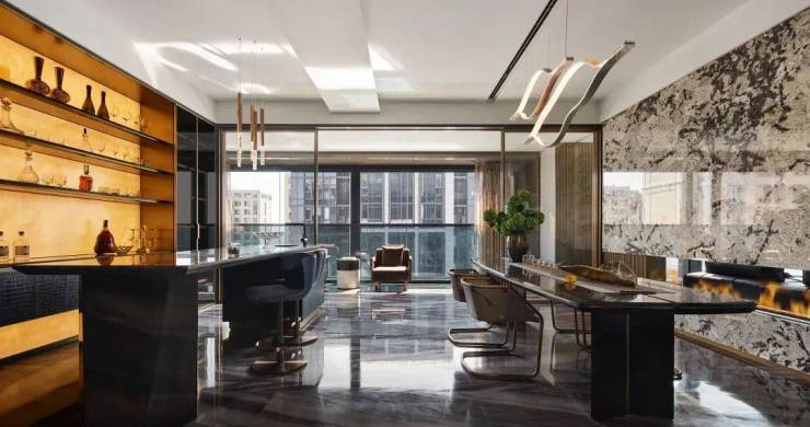 这份体验从电梯厅开始,地面采用奢石拼花,虚实结合的造景将归家仪式感发挥到极致。