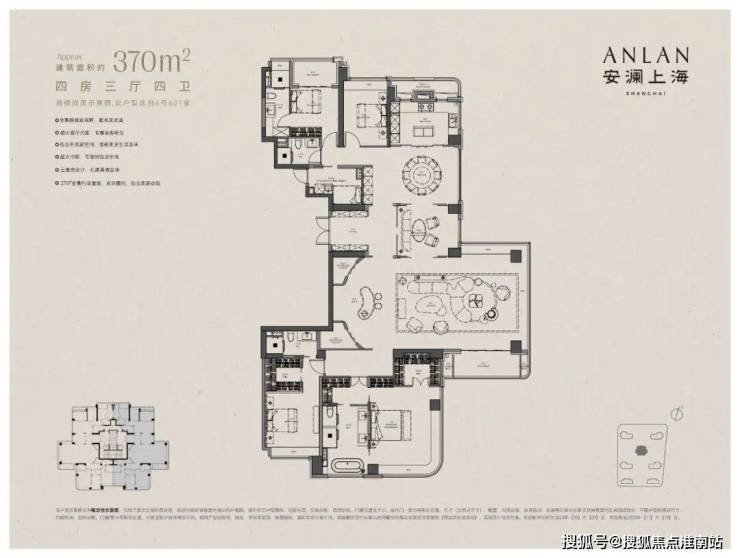 首先,不夸张的讲,建面约280㎡是我至今看过顶豪界最完美的四面宽全景舱户型。