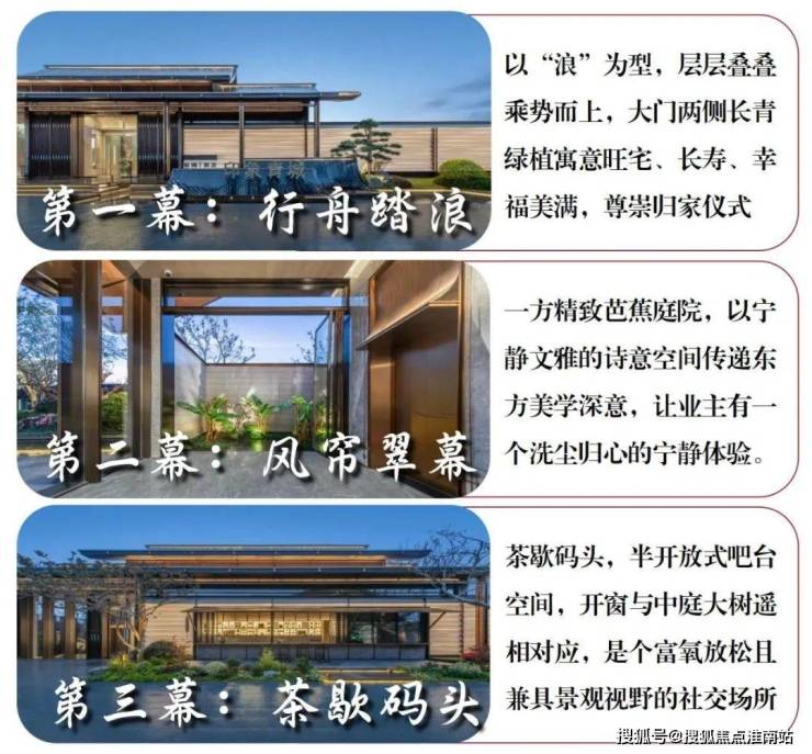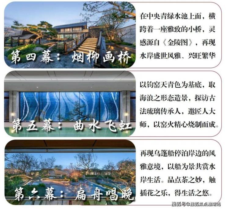 整个示范区集美学大成者,社区场景上花费大量心思打造,以建筑形态,用东方审美革新美学标准,创新升级,展示中心打造了“风雅三进,行舟六幕”的场景: