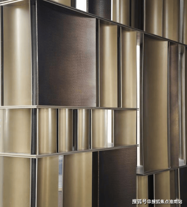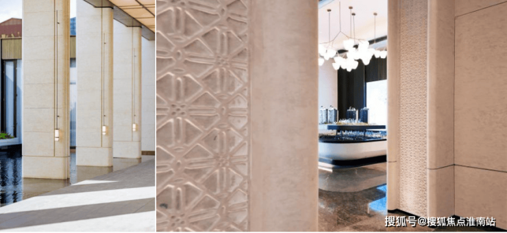 顶部定制发光云石亚克力与圆弧形的古铜色铝板交相辉映,8个西班牙宫殿沉香米黄石柱提升了尊崇感,漫步其间,揽风入怀,树影斑驳映入眼帘,水声潺潺入耳,归家的轻松感油然而生,笔者随手一拍,都非常的出圈。