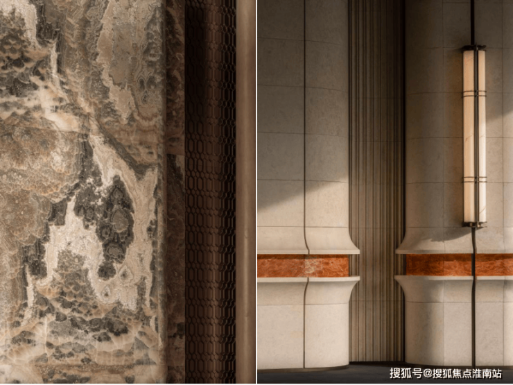 整个公区的引入沉香米黄、透光云石、安哥拉黑、福鼎黑、橙皮红、宝格丽紫等近二十种全球奢石,宛如一座流动的奢石博物馆。