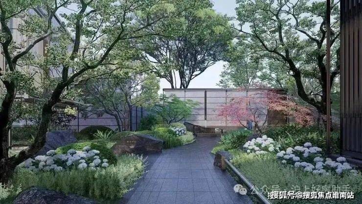 一条清韵石径,挑选造型独特的石头、三两组合成景,搭配特选的造型植物,极具艺术美感.而清泉石流景墙背后,就是未来业主的生活区.