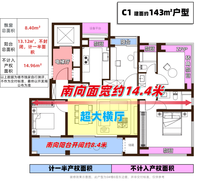 同样,这个户型经过专业测评发现,C1户型套内空间实际可利用率达到了91.9%(含飘窗、阳台,以上数据为楼市独家自行测评,不作为交付标准,最终以开发商公布为准),这意味着,C1户型已经看齐市面上建面约160-170㎡的大平层了!