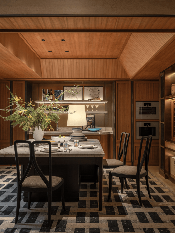 整体布局采用向心式的“打开”策略,会客区使用木地板拼花,私宴区则使用更符合场景的石材拼花。