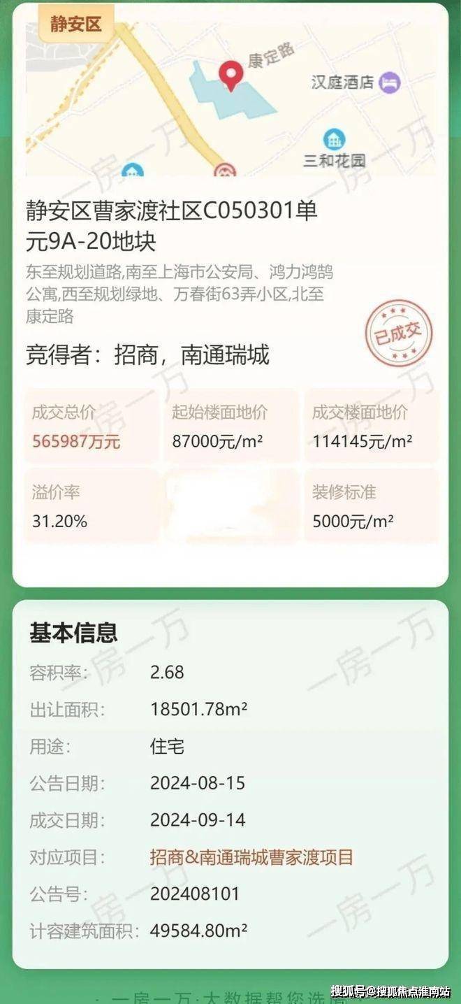 上海康定壹拾玖官方电话:400-9659-259✔(官方售楼处预约看房热线)静安区曹家渡社区C050301单元9A-20地块吸引4位竞买人,经过163轮竞价,由太仓沙桥置业有限公司(招商蛇口)与南通瑞城置业组成的联合体以56.6亿元竞得,成交楼板价超11.4万元/㎡,溢价率高达31.2%。