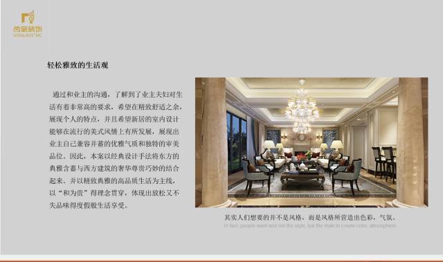 一品漫城别墅装修设计案例以经典设计手法将东方的典雅含蓄与西方建筑的奢华尊贵巧妙的结合起来。并以精致典雅的高品质生活为主线,以“和为贵”的理念贯穿,体现出轻松又不失品位的度假般的生活享受。