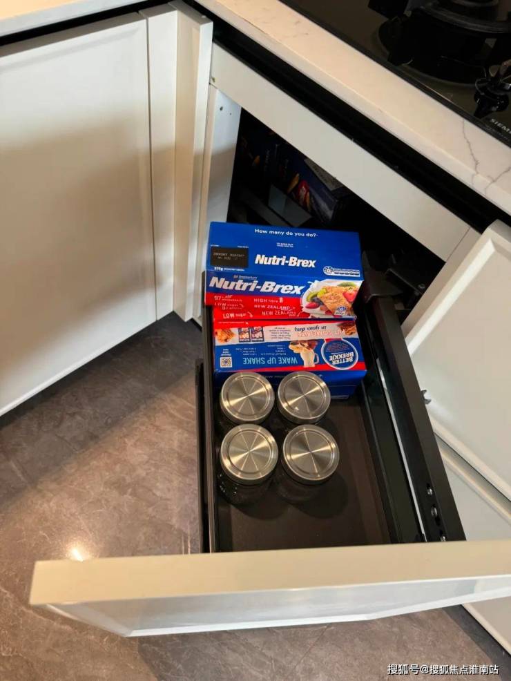 橱柜转角处的拉篮做了“轻松抽”,业主不必特别伸手探进去拿东西,非常省力。