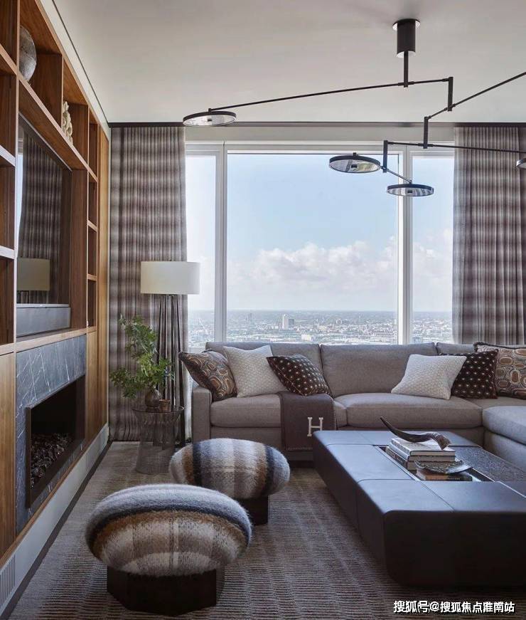 百分之百的优雅对材质的要求异常严格,而胡桃木的材质恰好强调了空间的高级感,利用老式LaVerne茶几、KellyWearstler的椅子和FortStreetStudio的地毯让人仿佛穿越回五十年代的复古时空.