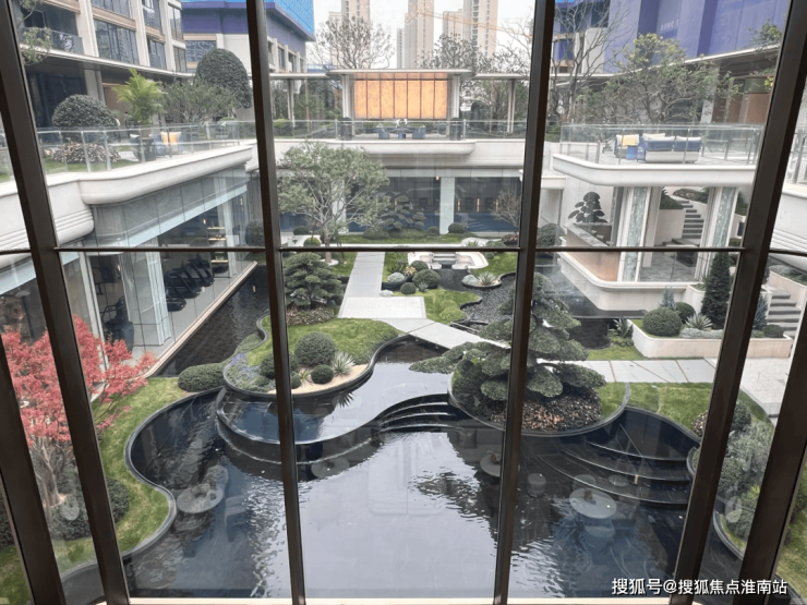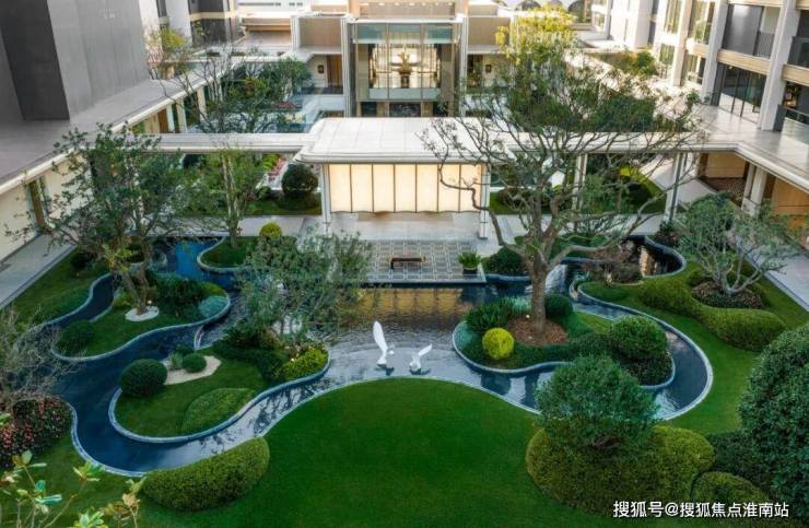 滨江经典的热带园林景观,种满了高大的热带树种;除了下沉式庭院中的水景外,园区中央还有一座异形景观水池。