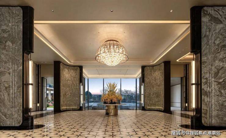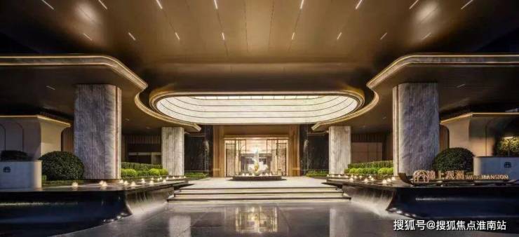 宽约78.8米、高约9.2米的大门,奥映鸣翠同款的梵高白石材,温润大气,与古铜色铝板的搭配,透出古典的韵味又不失轻盈。传统建筑穹顶元素也进行了现代化演绎,到了晚上灯光亮起,就变成了金碧辉煌的藻井。