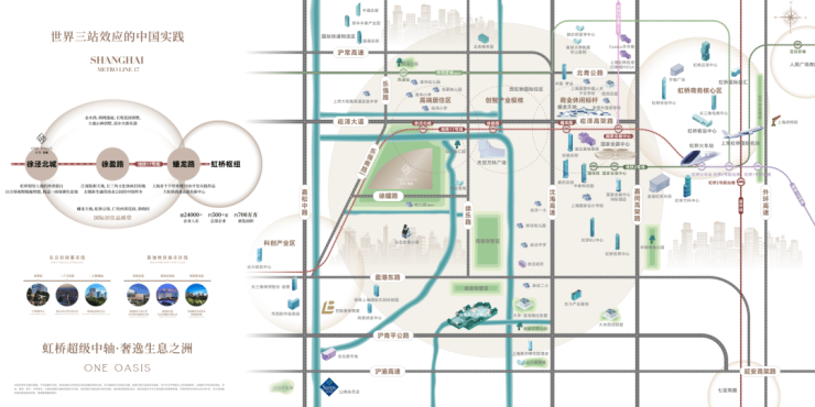 交通当面,项目北侧紧邻17号线徐泾北城站(需绕行河道),1站可达徐盈路天空万科广场,2站至蟠龙古镇商业区,3站直达国家会展中心,4站即达虹桥枢纽。