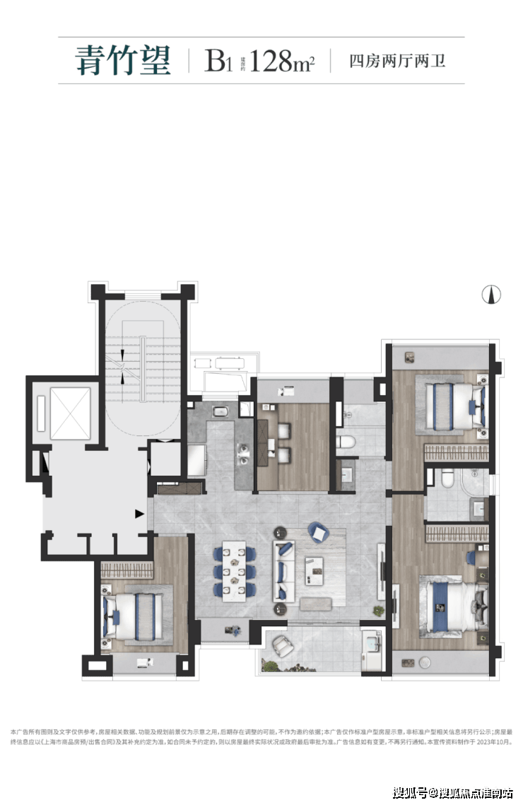 建面约128㎡的四房设计,在空间上使用功能更加扁平化,一站式解决了家庭生活的所有功能,优化居家动线,大大提升空间的居住体验。