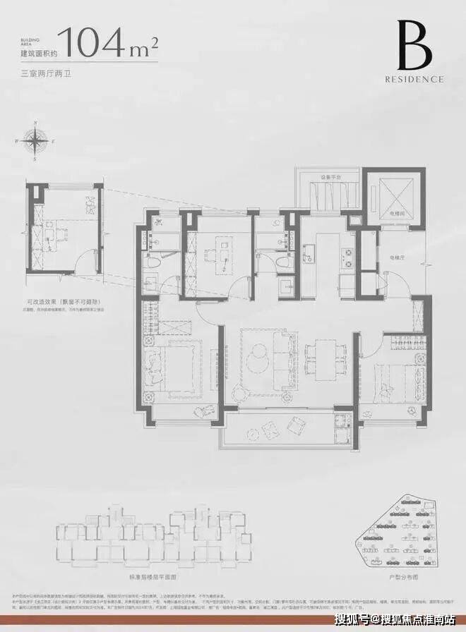 建面约104㎡3房2卫:
