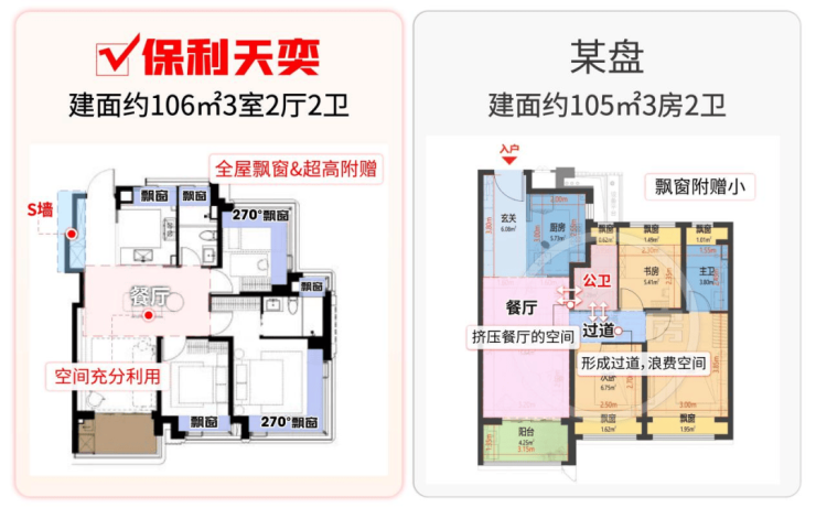 常规项目只有三个卧室有飘窗,而保利天奕做到“全屋飘窗”。不仅厕所、厨房间都有飘窗,边户还做到双约270°飘窗。