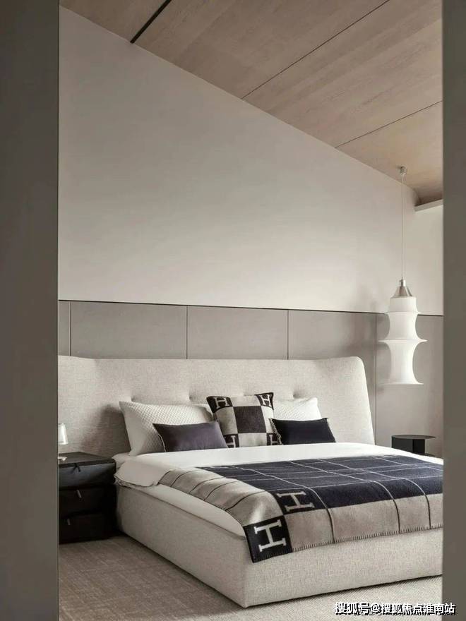 顶层设计成了卧室,温暖的白色调环绕着整个区域,木色和灰色搭配得很和谐,营造出安静又雅致的居住氛围。磨砂玻璃门把后面的衣柜藏起来了,还保持了室内的简洁和优雅。