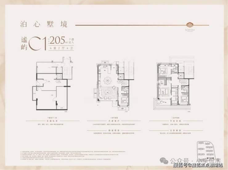 户型特点:下叠边套,南向面宽约9米,客餐厅同宽约5.8米,空间开阔。一楼设南向卧室,采光好且视野佳。二楼为三套房+主卧总统套房设计,主卫南向,可容纳浴缸和双台盆。地下室方正,附赠采光井,利用率高。