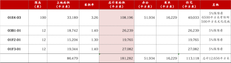 该项目包括4宗土地,包含3宗低密度住宅用地以及1宗商业、办公、住宅混合用地,底价约114亿。总建筑面积18.1万㎡,其中住宅建筑面积11.3万㎡,办公建筑面积5.2万㎡,商业建筑面积1.6万㎡。