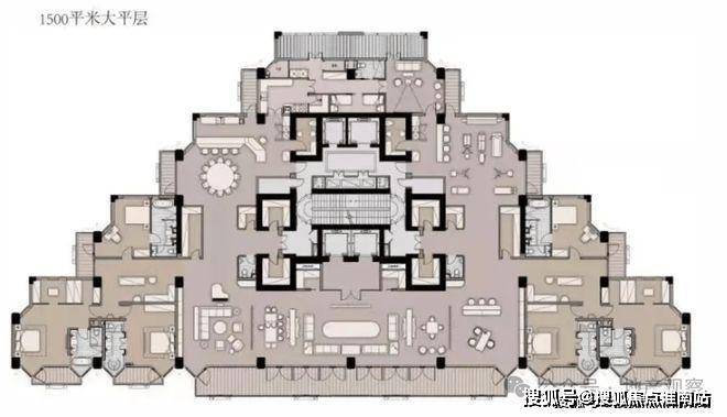 海泰·北外滩售楼处电话:400-811-8224(预约热线)对了,这是1500平的大平层户型图,金字塔形状尽量让每个房间能面朝南向没有遮挡,60米面宽和14个阳台的加持甚至让人怀疑住进去会不会迷路。