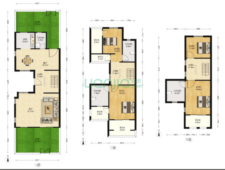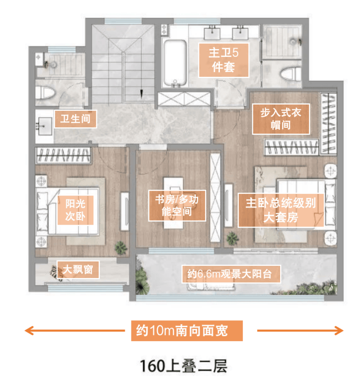跟下叠几乎是同款布局,上下双层约20m突破级南向五开间面宽,四房两厅三卫,4房全部朝南,收获同样震撼!