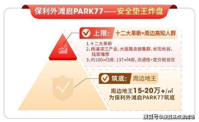 上海保利外滩启PARK77官方电话:400-8818-994✔(官方售楼处预约看房热线)再看项目价值底盘:周边地王售价预期15-20万+/㎡,为项目价值筑下坚实“安全底”;同时,项目自身“12大颠覆革新”产品力,叠加周边杨浦滨江科创产业、长阳创谷、大连路总部集群、陆家嘴金融产业的产业赋能,以及高校环绕的高知氛围,共同为项目打开了价值上限,“安全底+高上限”的组合,让资产安全性更有底气。