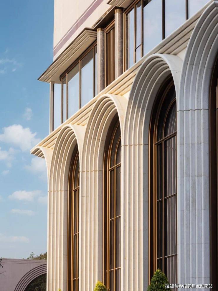 每一层挑檐都用仿石铝板叠加出9层折面,建筑四角以仿石铝板罗马立柱支撑,每根都雕出三段式结构,精致得像是一件艺术品。