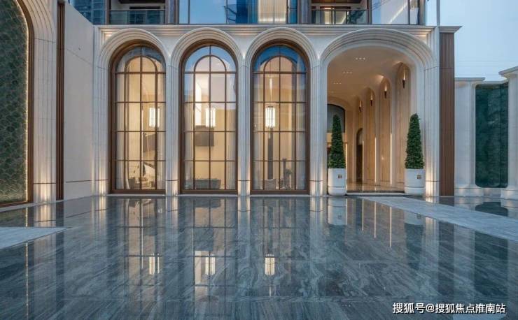 主入口两侧的景墙,通铺上了贝金米黄+宝格丽绿奢石。其间约540㎡的入口广场,镜面水景倒映着弧形景墙,神似一座水上宫殿。